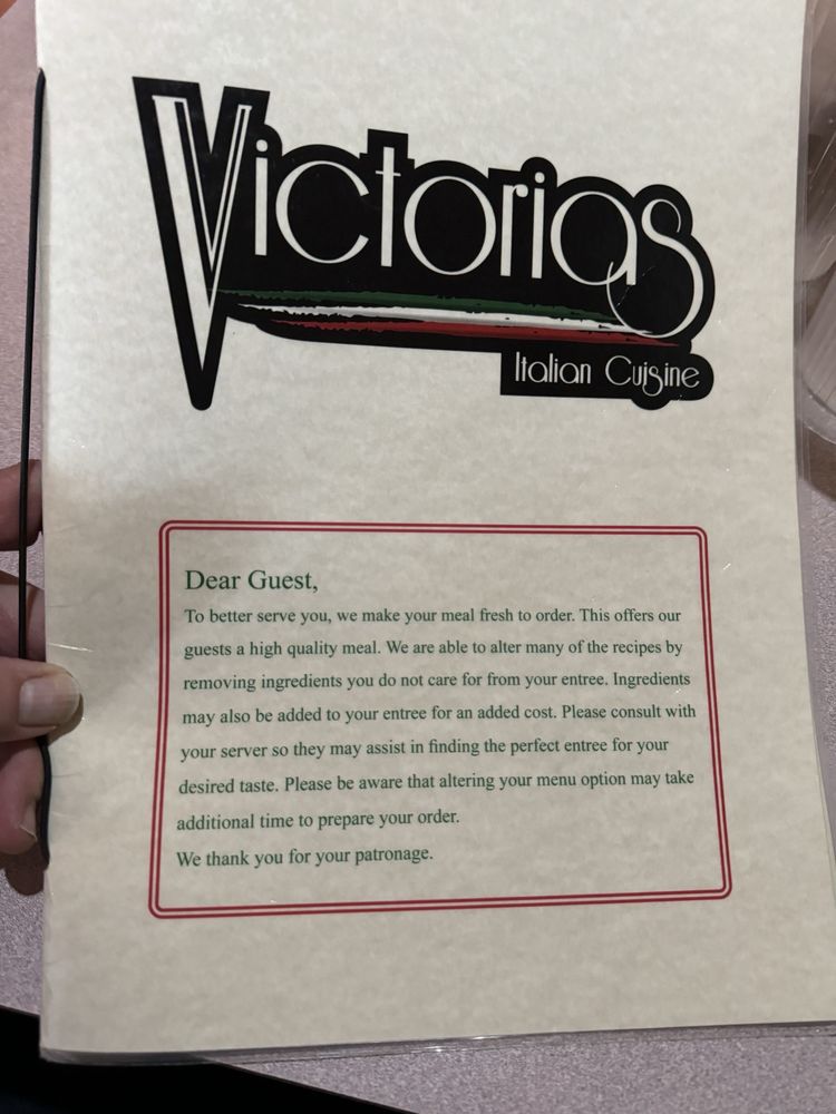 Victorias Italian Cuisine in Appleton, WI, is a hidden gem offering a wide range of Italian dishes. With a cozy and romantic ambiance, this restaurant is perfect for a casual lunch or a romantic dinner. The extensive menu features dishes with huge portions, perfect for sharing or taking leftovers home. The staff is accommodating and the prices are reasonable, making it a must-visit spot for Italian food lovers. The restaurant's history adds to its charm, with painted walls depicting little Italian scenes. From tasty garlic bread to delicious desserts, Victorias Italian Cuisine offers a variety of options to satisfy all taste buds. Whether dining in or opting for takeout, this restaurant is sure to leave you impressed with its authentic flavors and generous portions. Experience the essence of traditional Italian cuisine at Victorias Italian Cuisine.